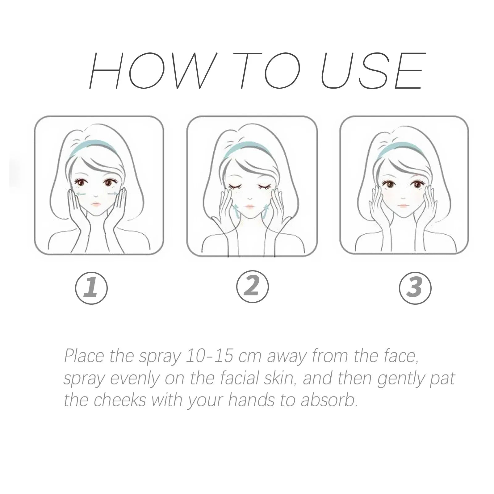 Place the spray 10-15 cm away from the face, spray evenly on the facial skin, and then gently pat the cheeks with your hands to absorb.
